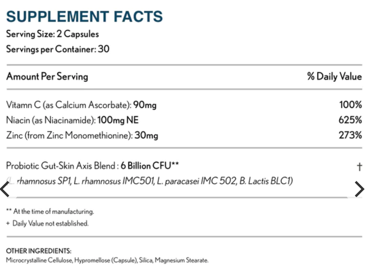Probiotic Gut-Skin Axis Blend: proprietary blend of 4 probiotics found to help support acne-prone skin, as well as support digestive health, support microbiome balance, and support overall gut health*