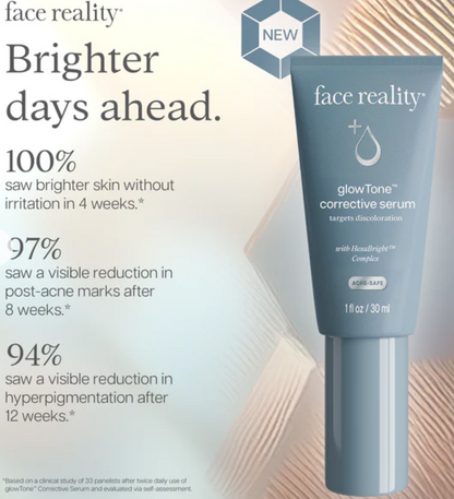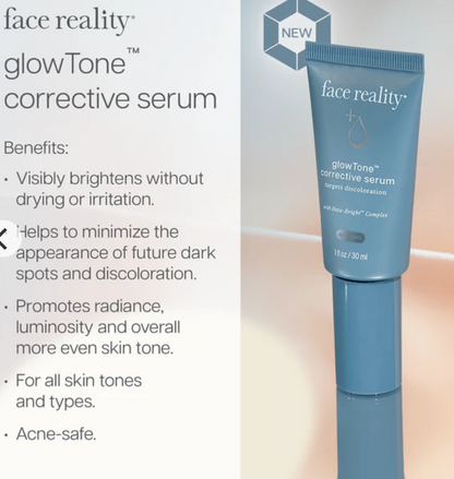 GlowTone™ Corrective Serum is your go-to brightening solution for reducing post-inflammatory hyperpigmentation (PIH) and other discoloration such as sun damage, dark spots, age spots, and uneven skin tone. Featuring the advanced, proprietary Hexa-Bright™ Complex, a powerful combination of actives, it provides visibly brightening results safely and effectively for all skin types and tones. And, as with all Face Reality products, glowTone™ Corrective Serum is acne-safe.